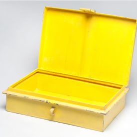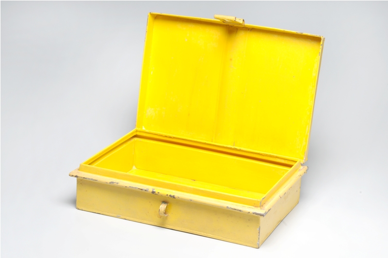 De formato retangular, composto por tampa e corpo, unidos por dobradiça, pintada na cor amarela interna e externamente.Tampa lisa com alça móvel na parte central e lingueta na parte da frente. Corpo liso com encaixe para lingueta e borda para apoio da tampa.