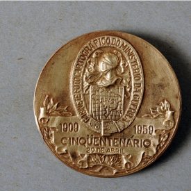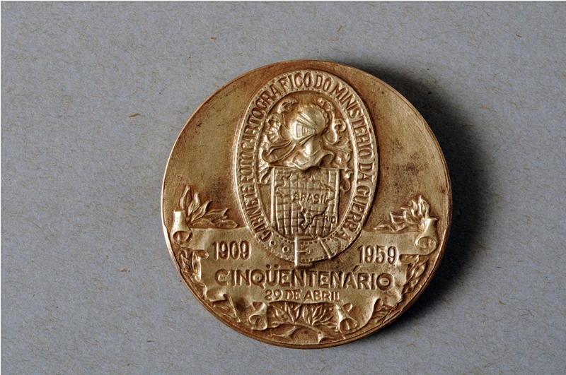 Forma: circular com bordo liso. Anverso: ao centro busto de figura masculina de ¾ à esquerda, calvo, com óculos e bigode, trajando terno com gravata; contornando, a inscrição: "ANTONIO LUIZ DE FREITAS PEREIRA". Reverso: dentro de elipse fechada por fivela com inscrição: "GABINETE FOTOCARTOGRÁFICO DO MINISTÉRIO DA GUERRA", escudo de campo recortado por linha horizontais e verticais com mapa brasileiro e inscrições: "BRASIL/RIO", encimado por elmo fechado com paquifes e lambrequins; abaixo sobre dois ramos, cartela com a inscrição: "1909 1959/CINQÜENTENÁRIO/29 DE ABRIL", .