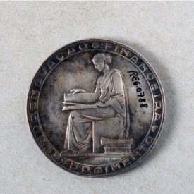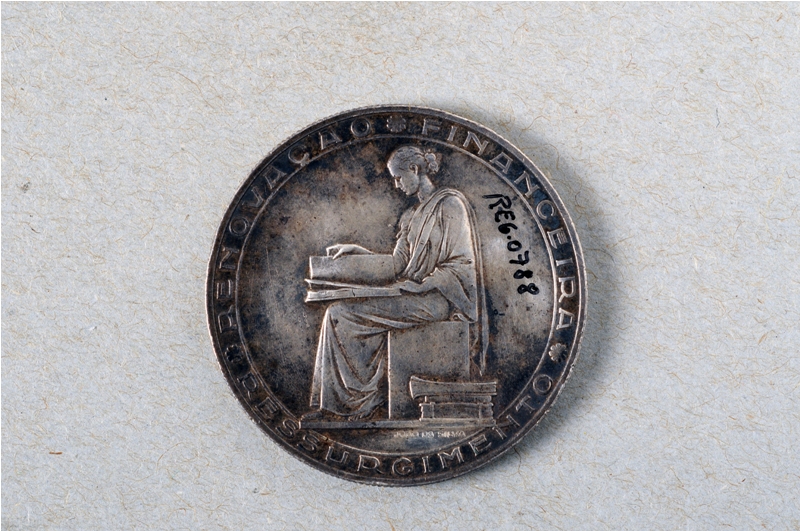 Forma: circular com rebordo e bordo serrilhado. Anverso: em campo escudo português sobre esfera armilar, ladeado pela inscrição: "20", "ESC", na orla a inscrição: "REPUBLICA PORTUGUESA 1953". Reverso: ao centro figura de feminina de perfil à esquerda, sentada sobre bloco, traja indumentária longa e cabelos enrolados em coque; com livros junto ao bloco e folheando outro, na orla a inscrição: "RENOVAÇÃO FINANCEIRA RESSURGIMENTO".